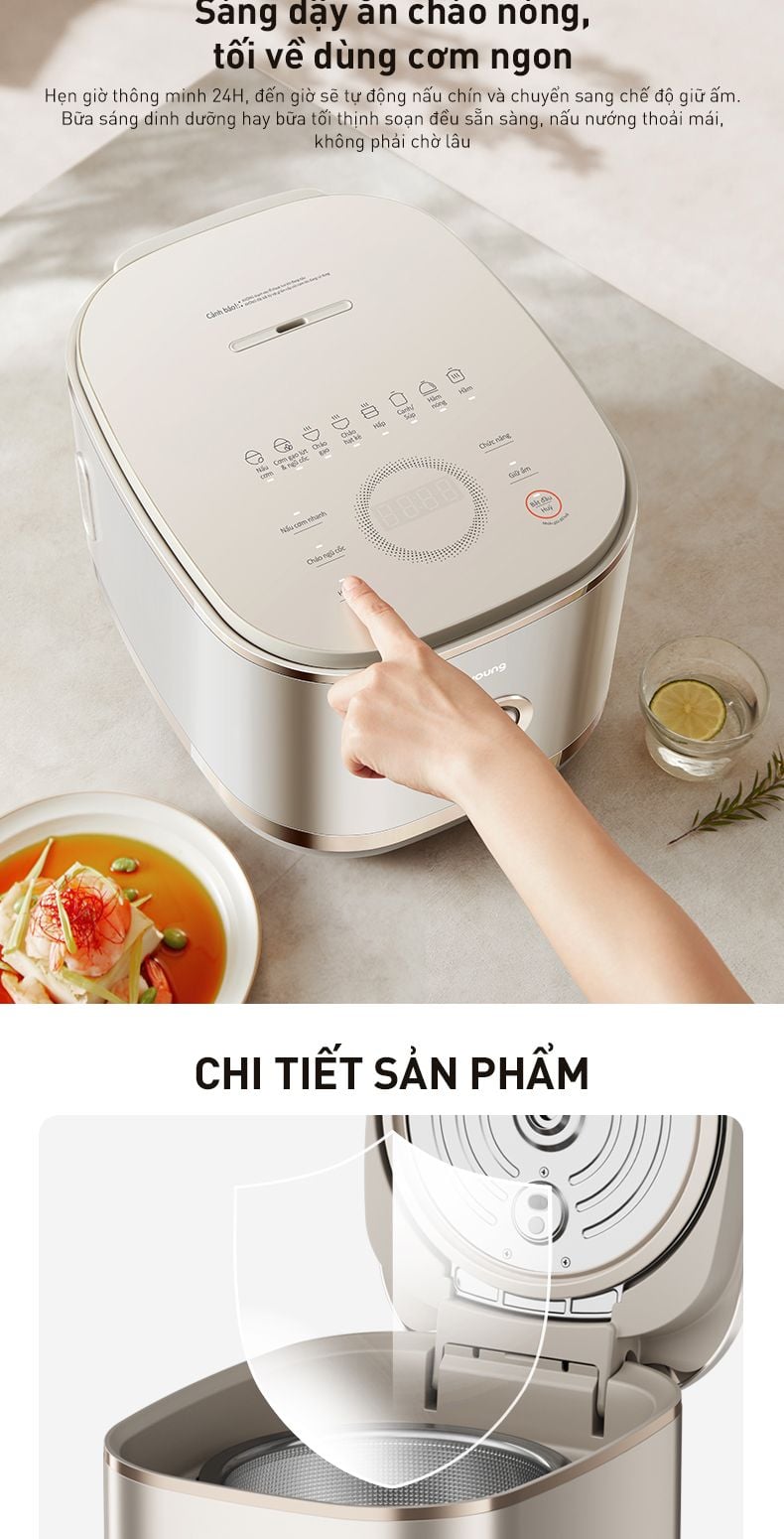 - Hẹn giờ thông minh 24H: Đến giờ sẽ tự động nấu chín và chuyển sang chế độ giữ ấm, sáng tối đều có món ngon chờ sẵn.