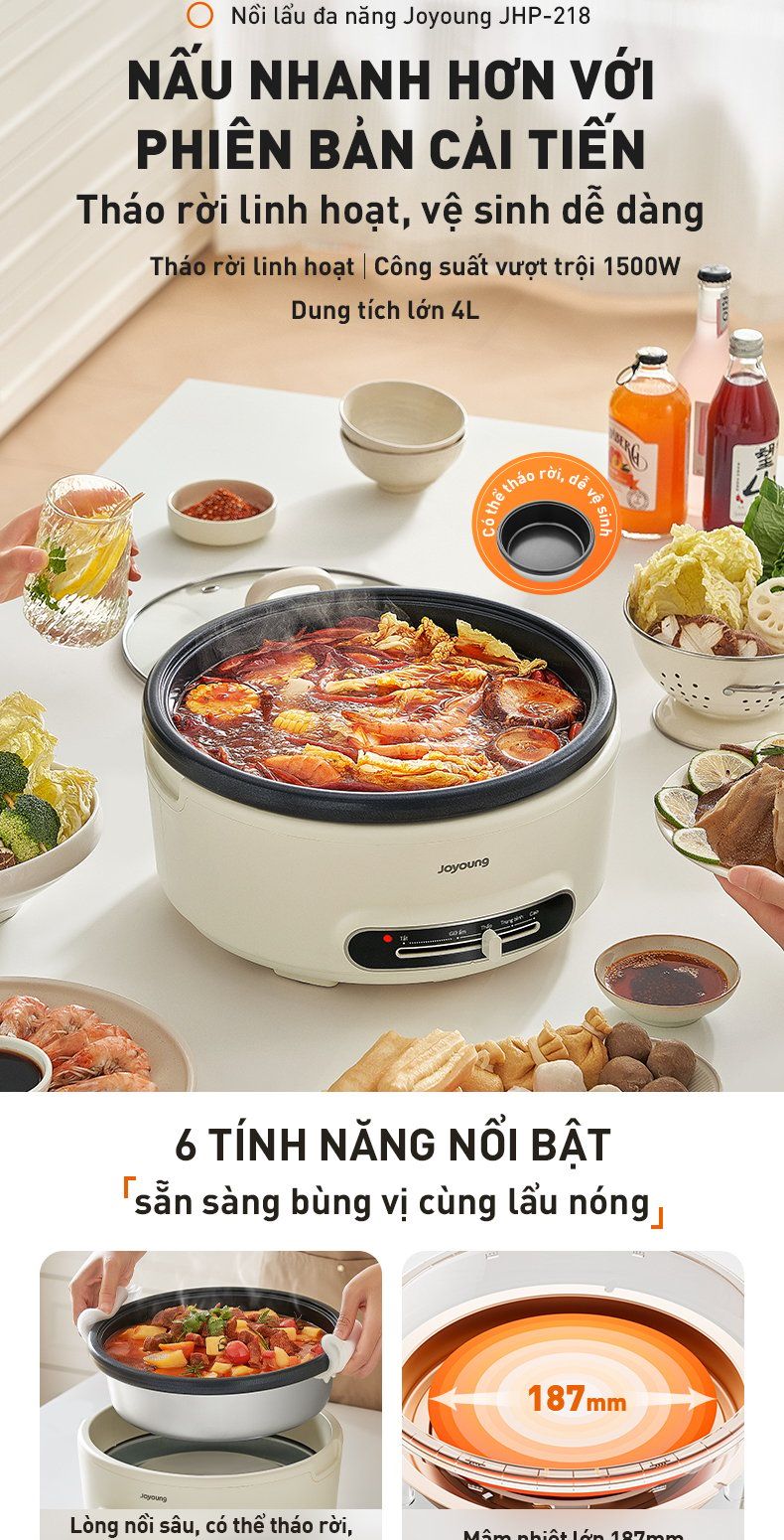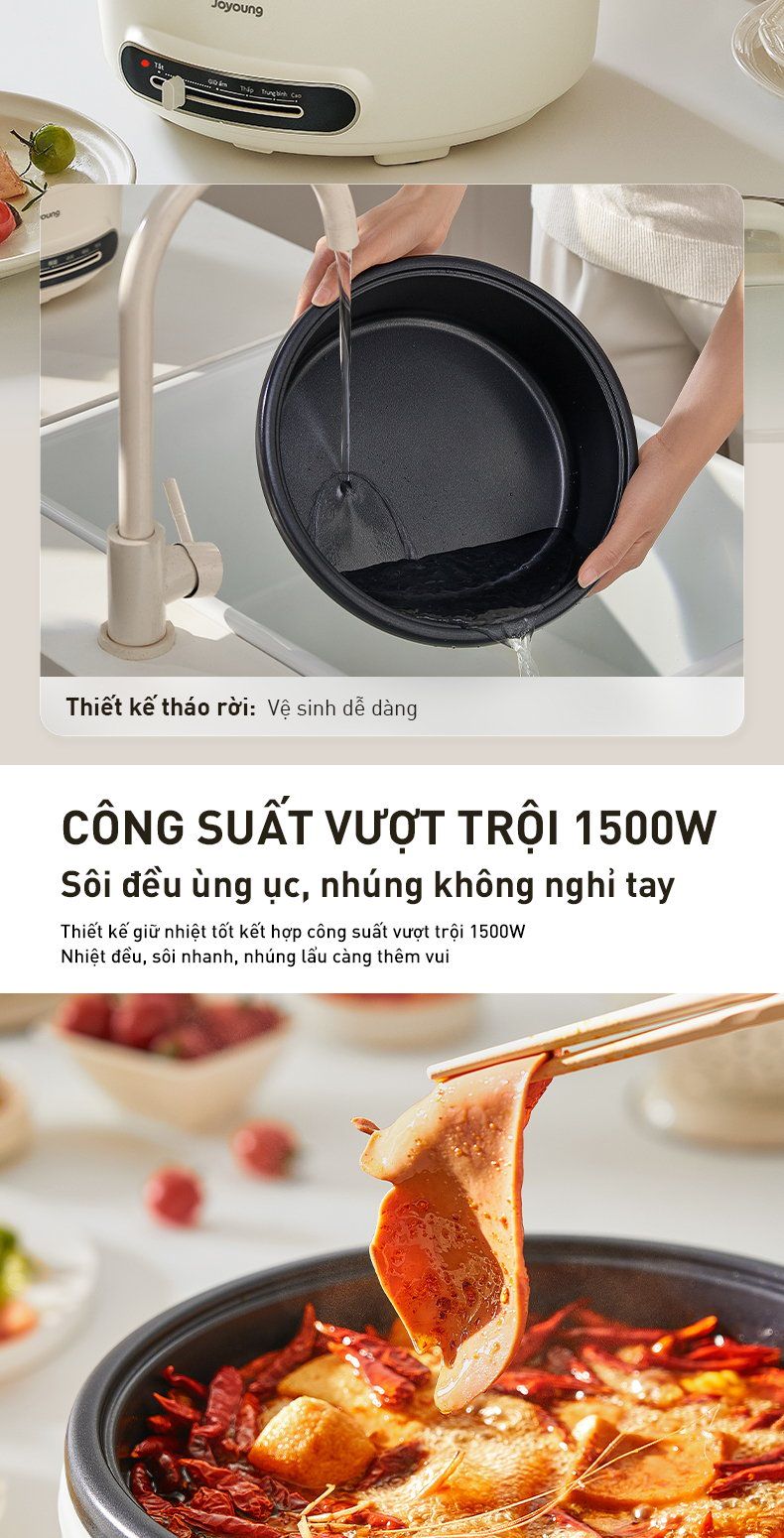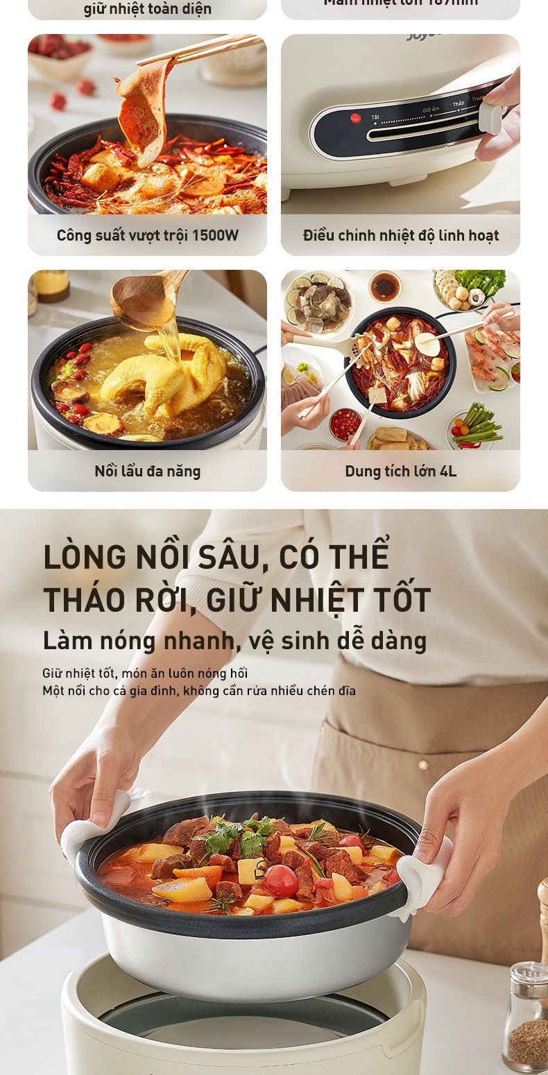 - Lòng nồi sâu, có thể tháo rời, giữ nhiệt tốt: Làm nóng nhanh, giữ nhiệt tốt, món ăn luôn nóng hổi và vệ sinh dễ dàng.