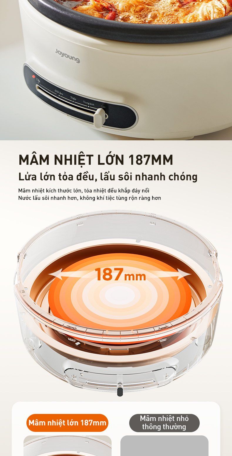 - Mâm nhiệt lớn 187mm: Mâm nhiệt kích thước lớn, tỏa nhiệt đều khắp đáy nồi, nước lẩu sôi nhanh hơn.