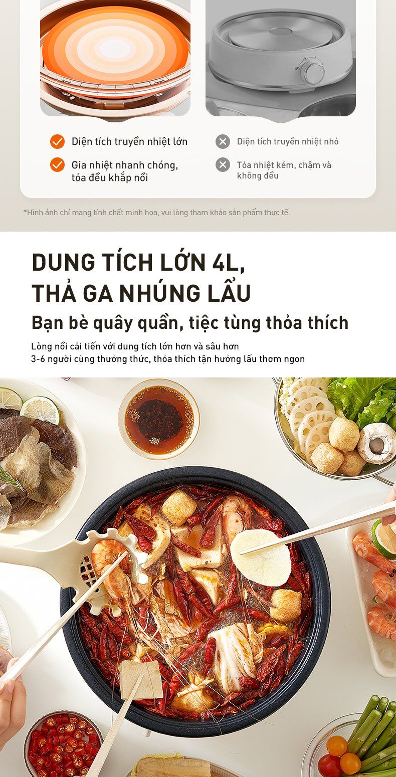 - Dung tích lớn 4L: 3-6 người cùng thưởng thức, thỏa thích tận hưởng lẩu thơm ngon.