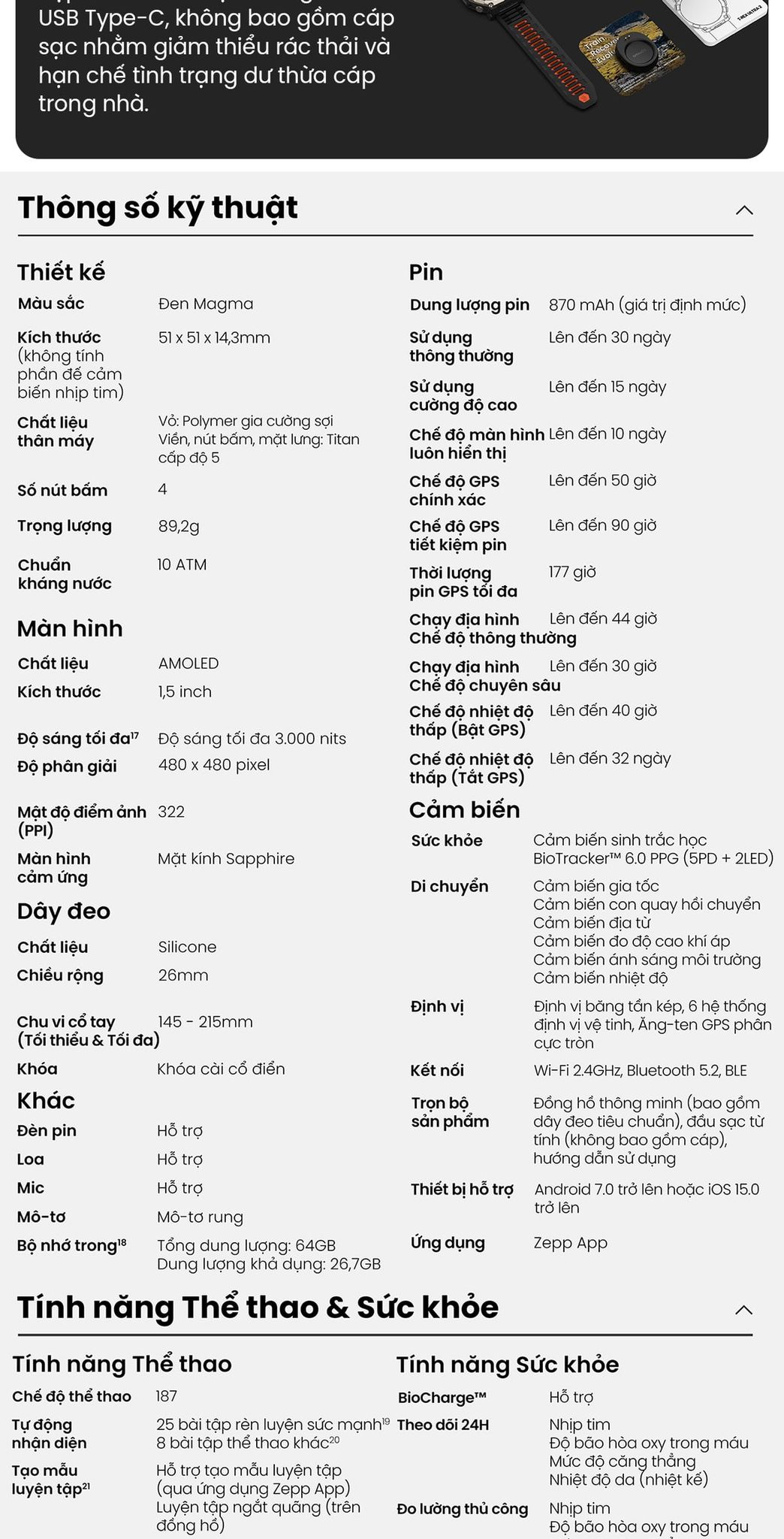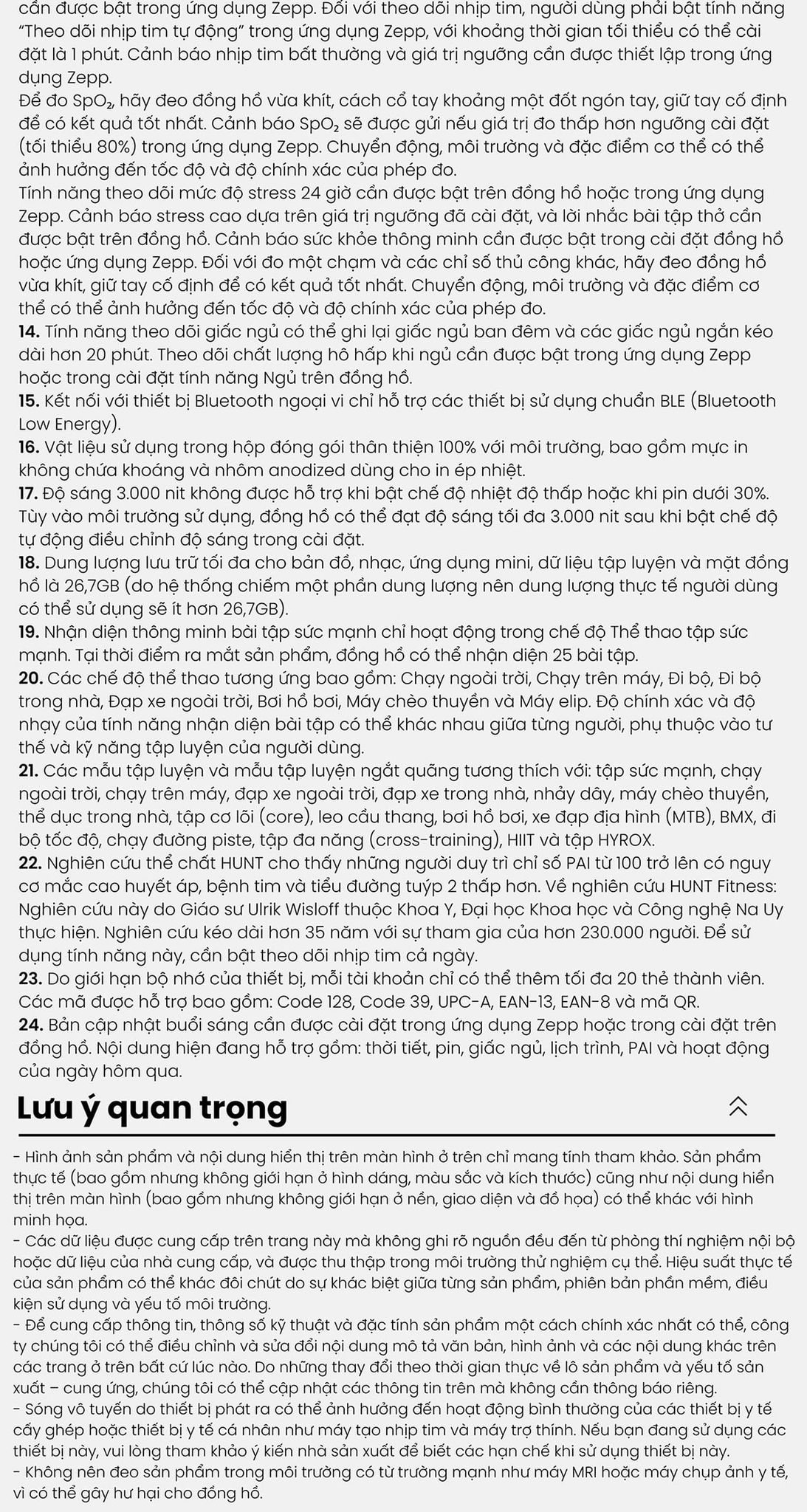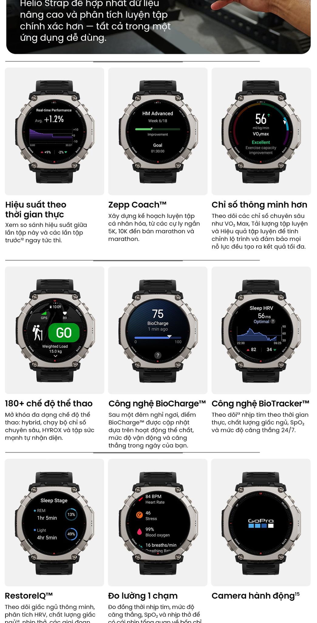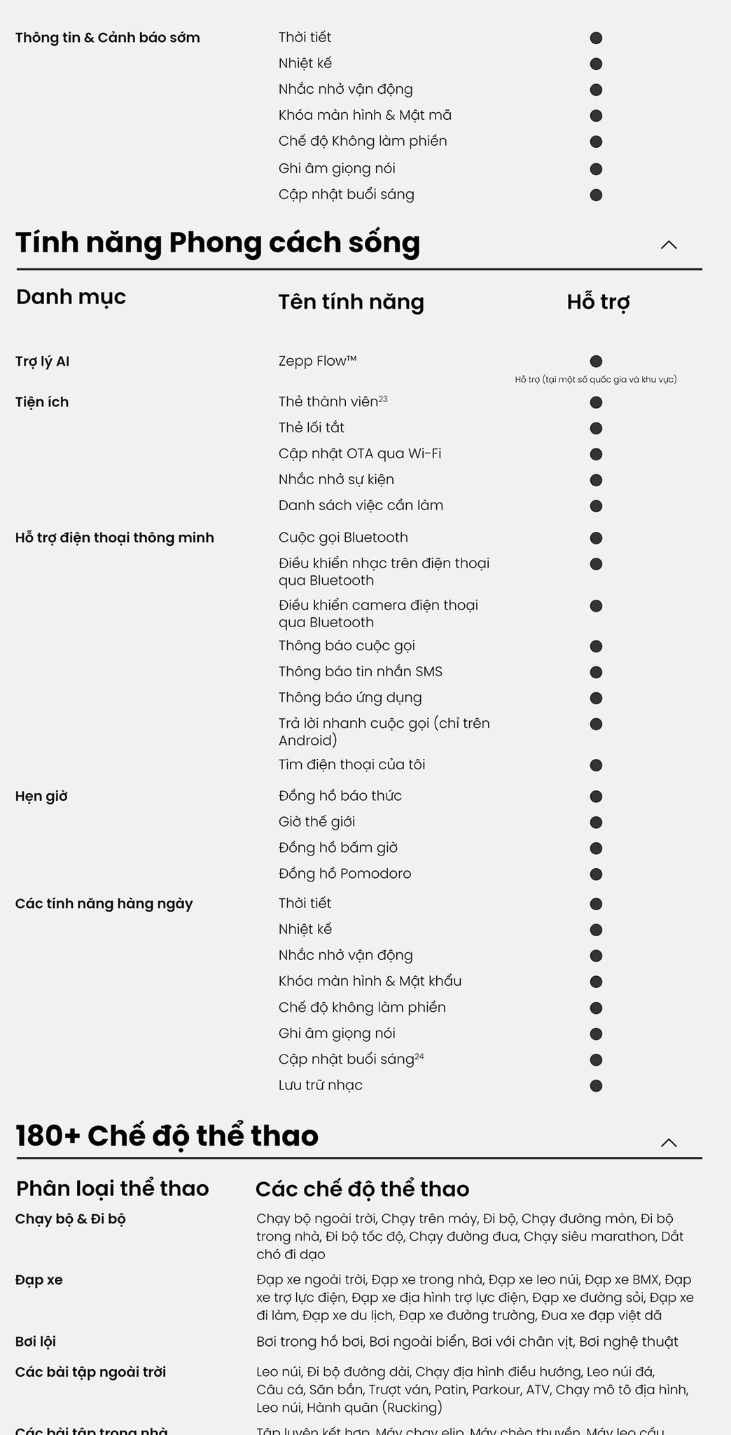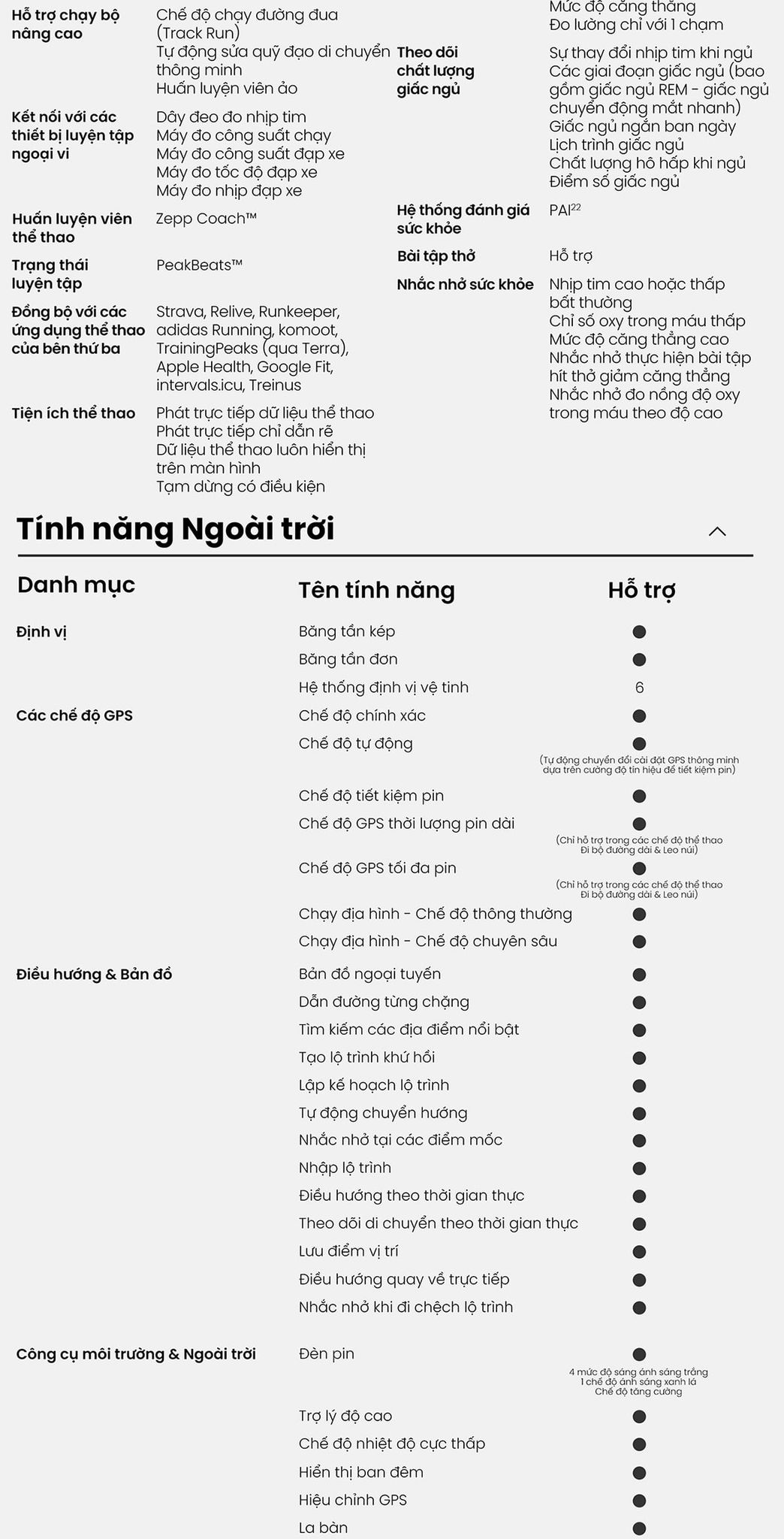 - Zepp Coach™: Nhận chương trình luyện tập cá nhân hóa do AI xây dựng, gồm kế hoạch chạy 5K, 10K, bán marathon và marathon. Kế hoạch tự điều chỉnh theo hiệu suất tập luyện và mức độ phục hồi của bạn.