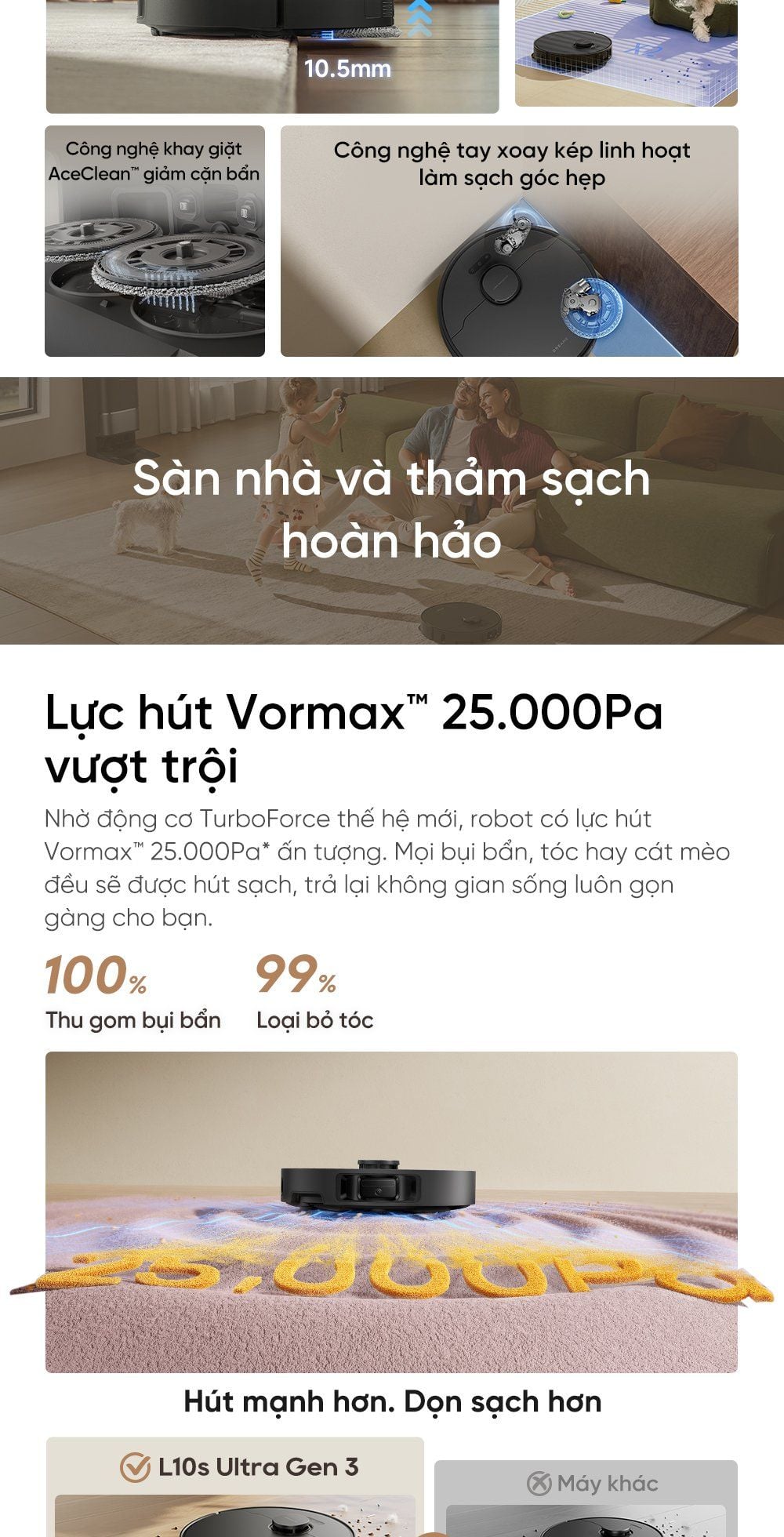 Lực hút Vormax™ 25.000Pa vượt trội: Nhờ động cơ TurboForce thế hệ mới, robot có lực hút Vormax™ 25.000Pa* ấn tượng. Mọi bụi bẩn, tóc hay cát mèo đều sẽ được hút sạch, trả lại không gian sống luôn gọn gàng cho bạn.