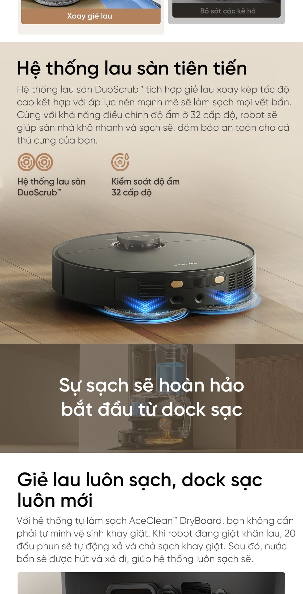 Giẻ lau luôn sạch, dock sạc luôn mới: Với hệ thống tự làm sạch AceClean™ DryBoard, bạn không cần phải tự mình vệ sinh khay giặt. Khi robot đang giặt khăn lau, 20 đầu phun sẽ tự động xả và chà sạch khay giặt. Sau đó, nước bẩn sẽ được hút và xả đi, giúp hệ thống luôn sạch sẽ.