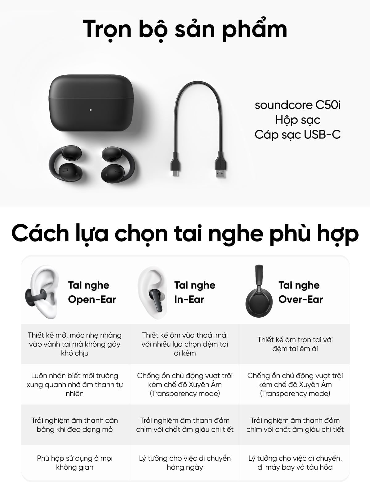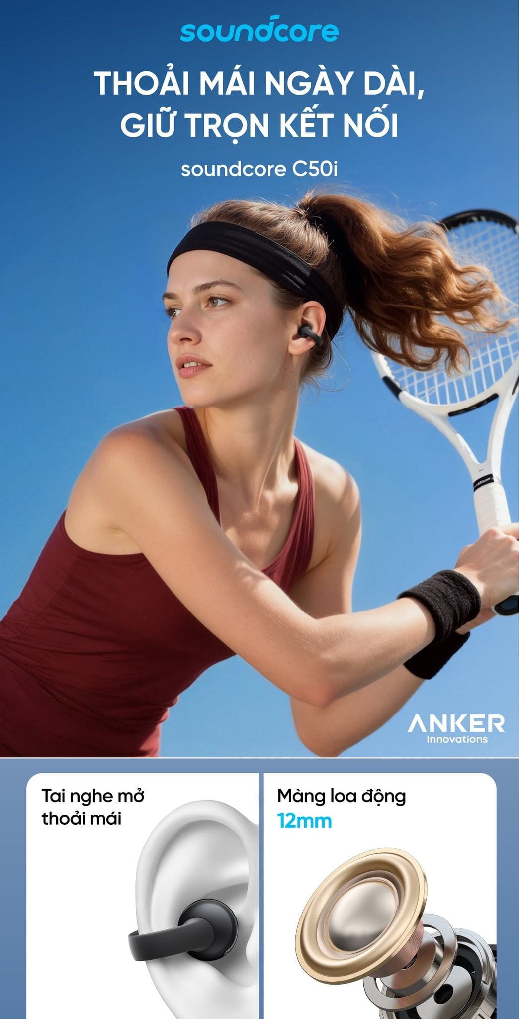 Tai nghe bluetooth Open-Ear soundcore C50i được thiết kế theo vòng cung công thái học độc đáo, mang đến cảm giác vừa vặn, nhẹ nhàng khi sử dụng. Chất âm sâu lắng giúp bạn đắm chìm trong từng giai điệu, cảm nhận trọn vẹn sự sống động và liền mạch của âm thanh.