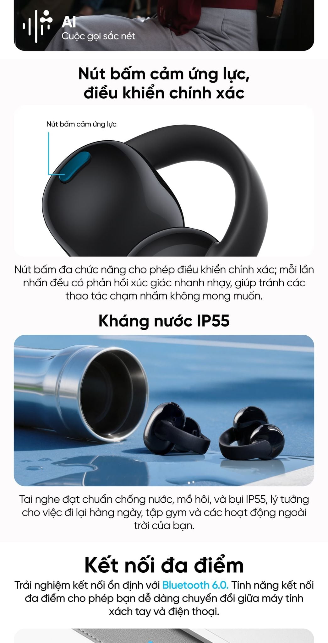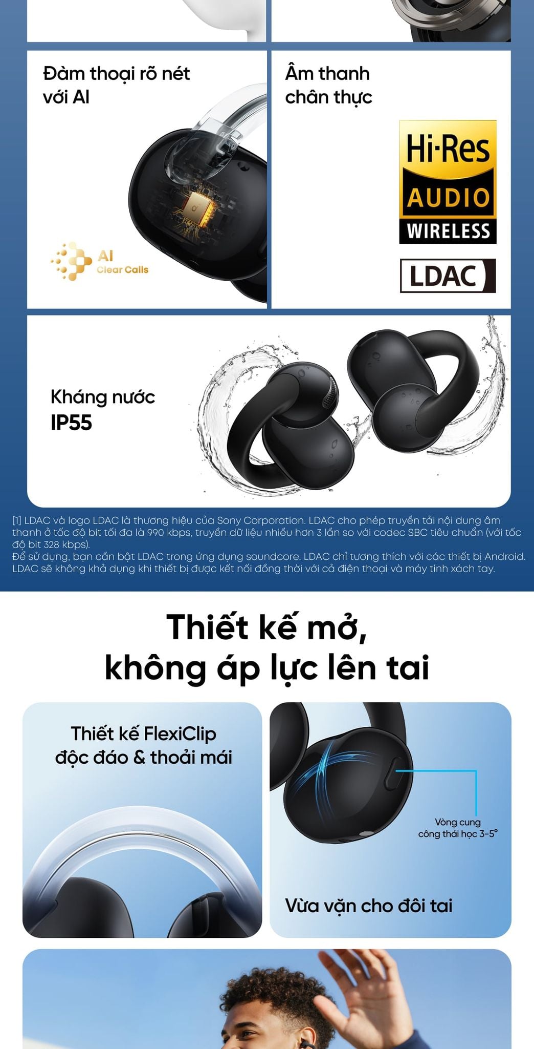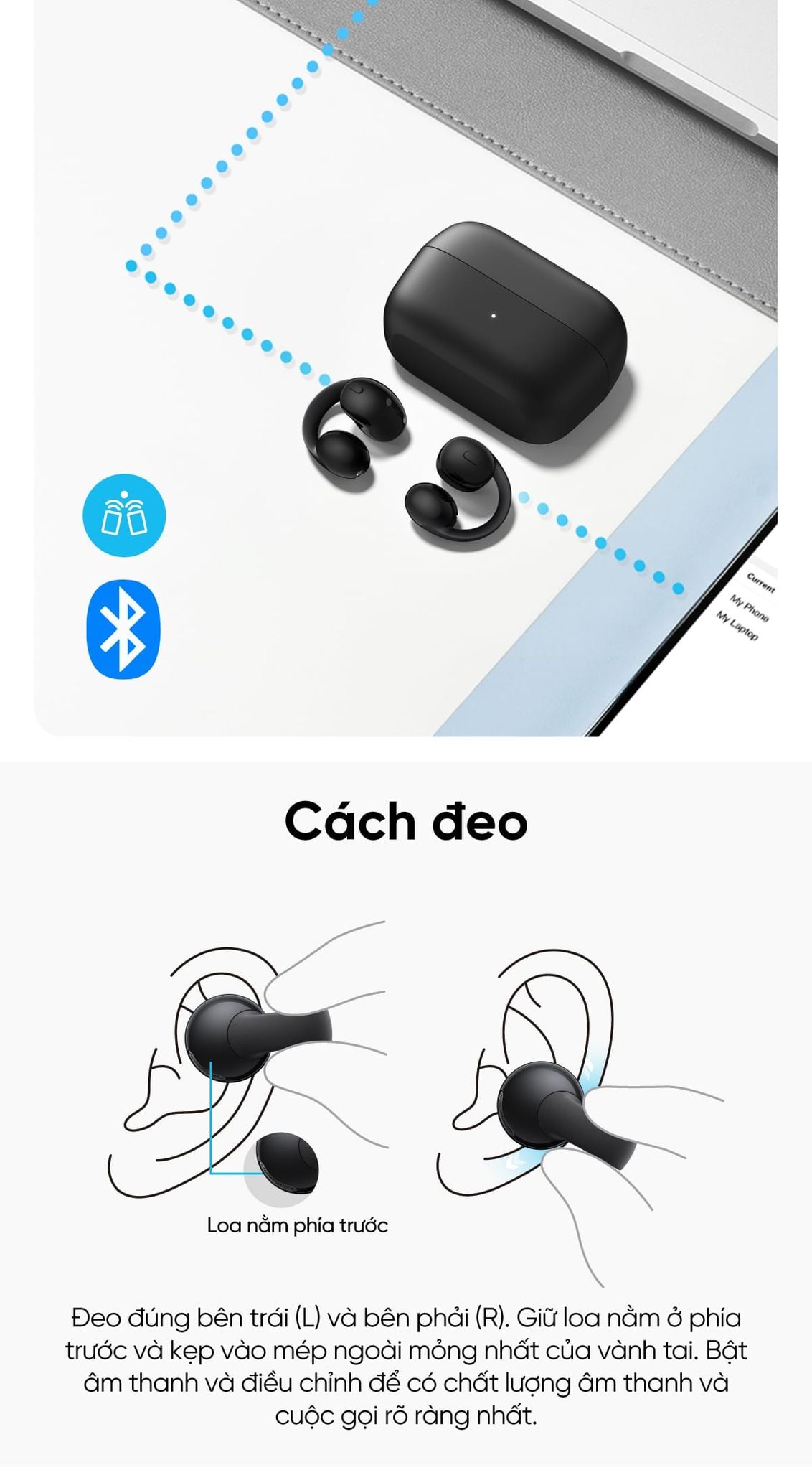 - Thiết kế mở, không áp lực lên tai: Thiết kế FlexiClip độc đáo & thoải mái với vòng cung công thái học 3-5° luôn vừa vặn cho đôi tai