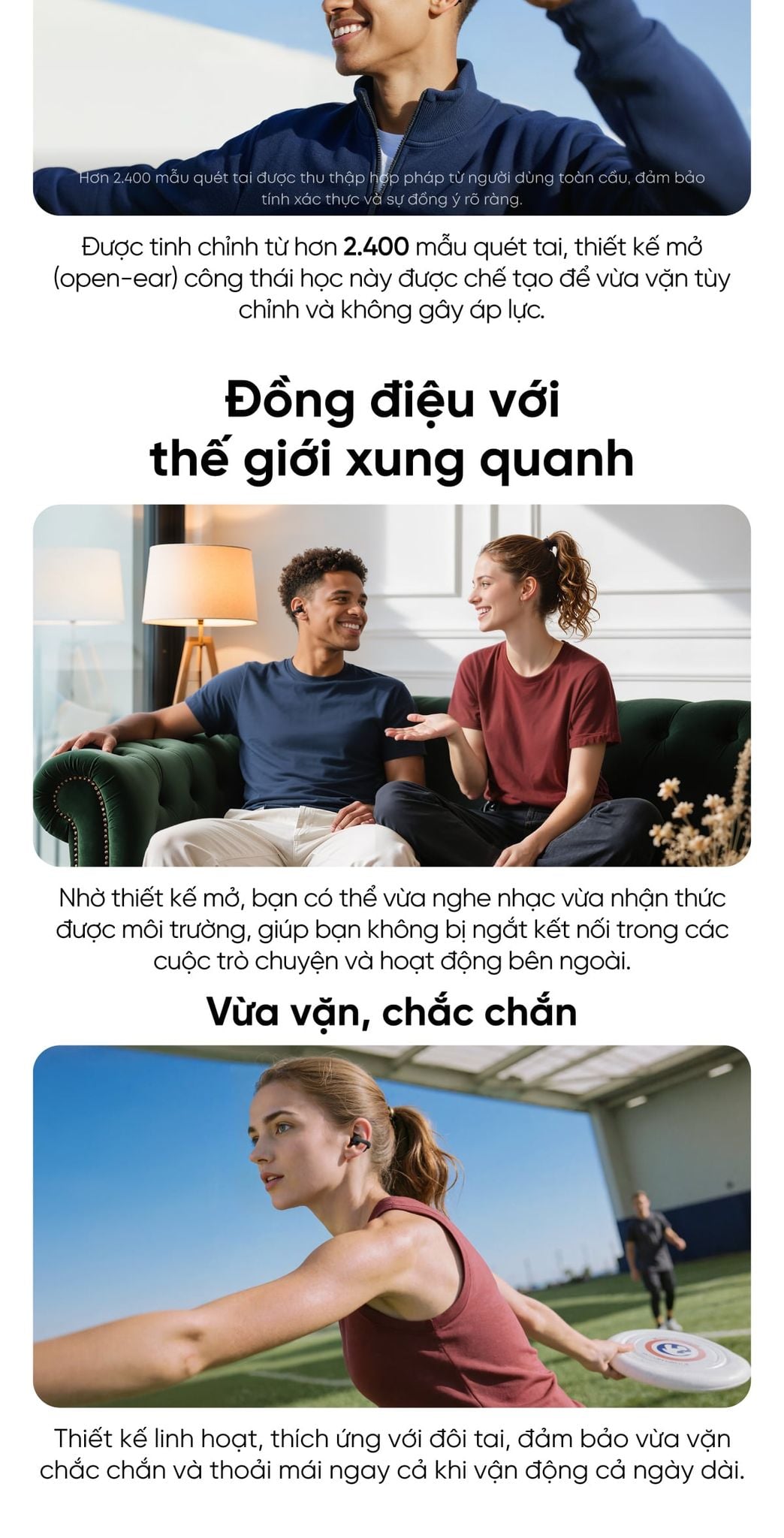 - Nhờ thiết kế mở, bạn có thể vừa nghe nhạc vừa nhận thức được môi trường, giúp bạn không bị ngắt kết nối trong các cuộc trò chuyện và hoạt động bên ngoài.
