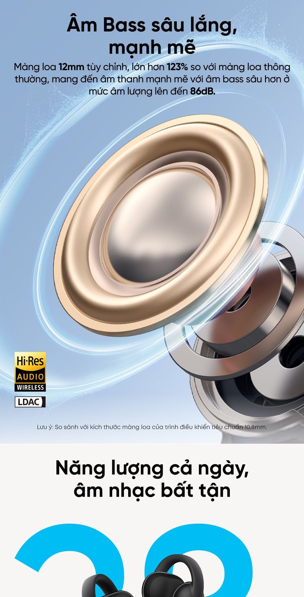 - Âm Bass sâu lắng, mạnh mẽ: Màng loa 12mm tùy chỉnh, lớn hơn 123% so với màng loa thông thường, mang đến âm thanh mạnh mẽ với âm bass sâu hơn ở mức âm lượng lên đến 86dB.