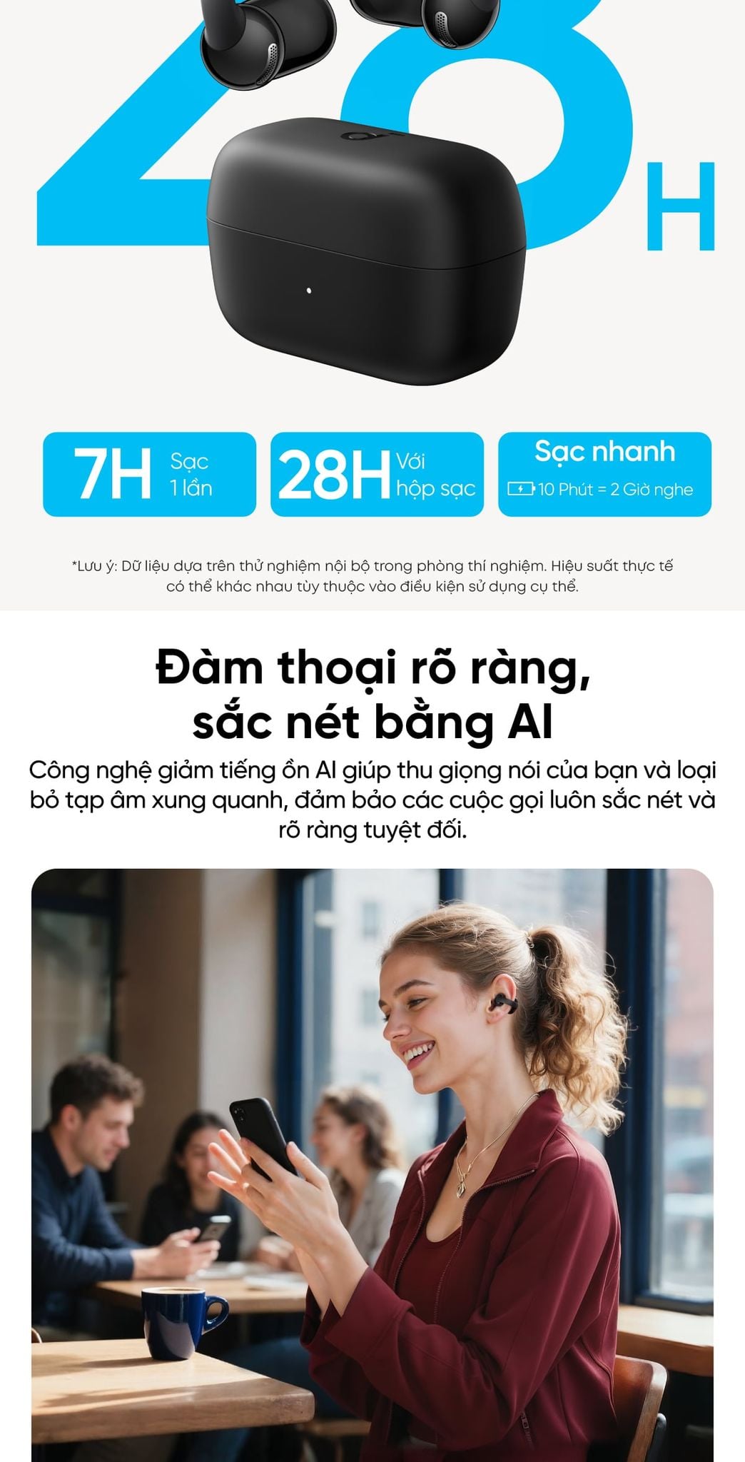 - Năng lượng ngày dài, âm nhạc bất tận: 7H khi sạc 1 lần, 28H với hộp sạc, sạc nhanh 10 phút = 2 giờ nghe