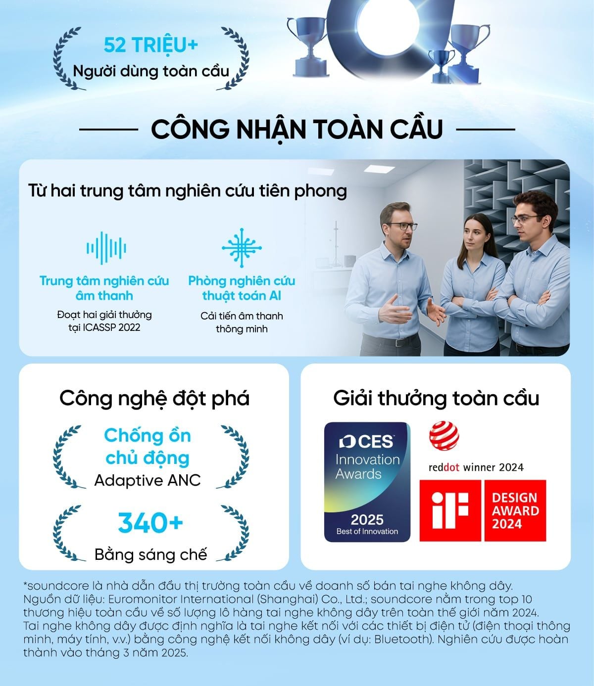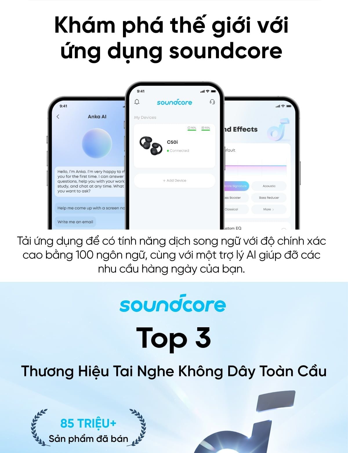 - Khám phá thế giới với ứng dụng soundcore: Tải ứng dụng để có tính năng dịch song ngữ với độ chính xác cao bằng 100 ngôn ngữ, cùng với một trợ lý AI giúp đỡ các nhu cầu hàng ngày của bạn.