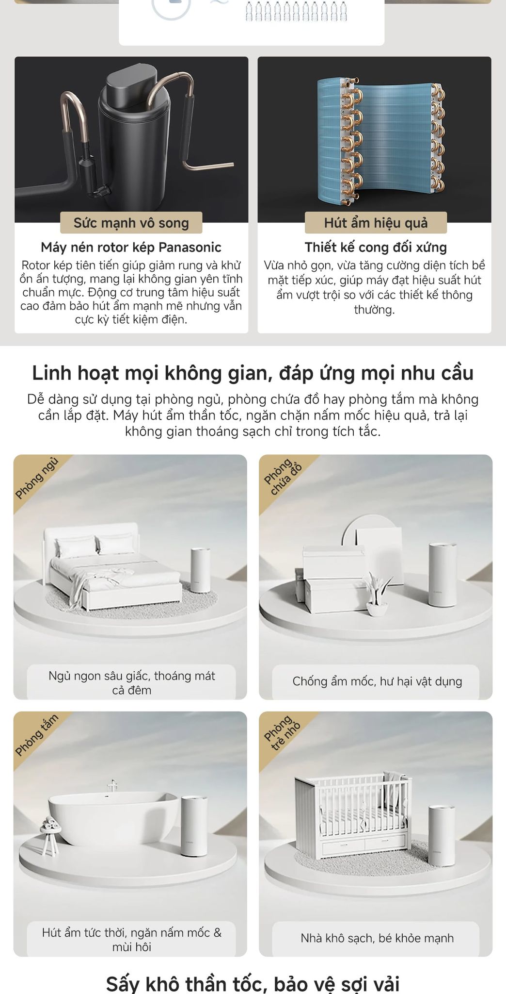 - Máy nén rotor kép Panasonic: Rotor kép tiên tiến giúp giảm rung và khử ồn ấn tượng, mang lại không gian yên tĩnh chuẩn mực. Động cơ trung tâm hiệu suất cao đảm bảo hút ẩm mạnh mẽ nhưng vẫn cực kỳ tiết kiệm điện.