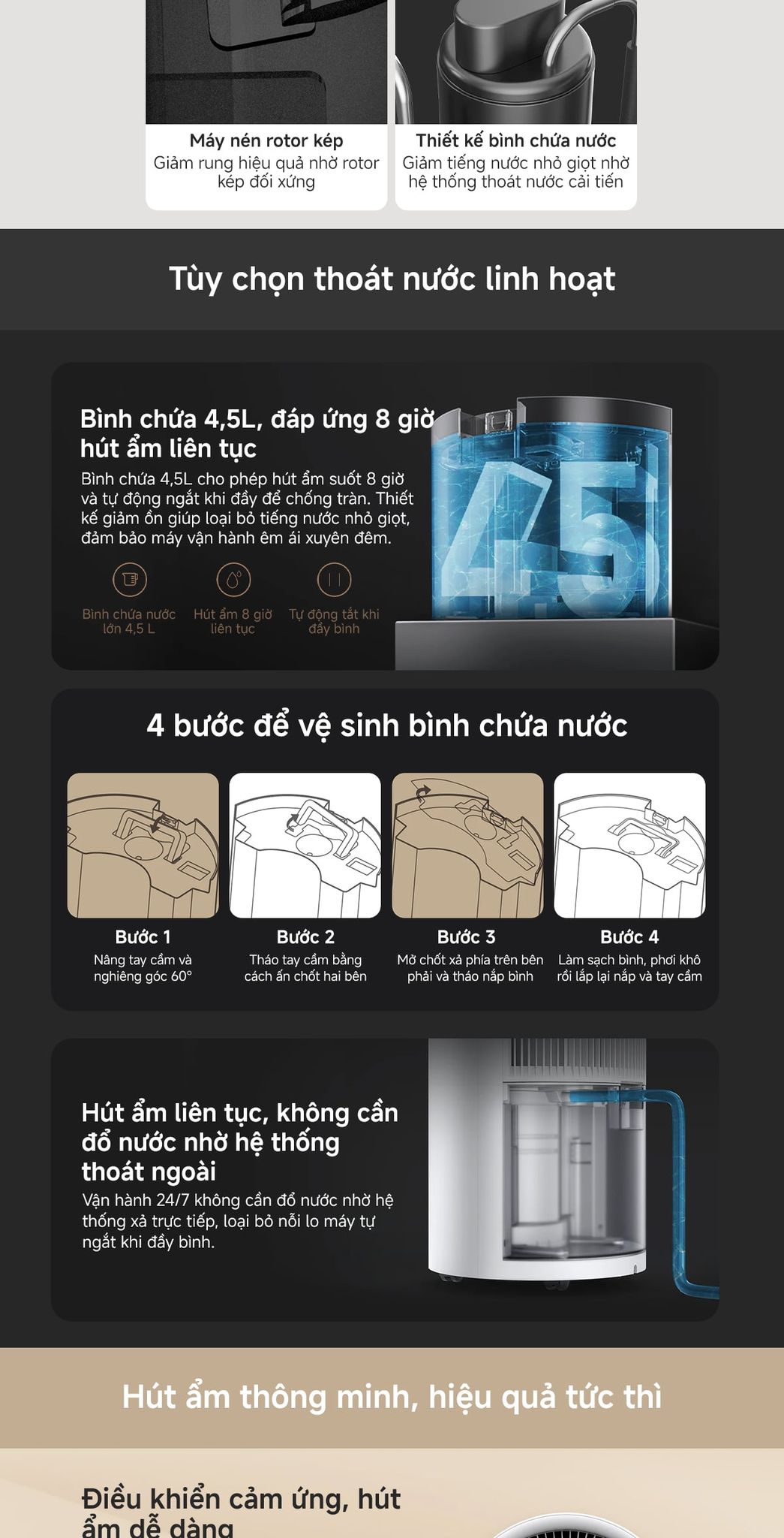 - Bình chứa 4,5L: Đáp ứng 8 giờ hút ẩm liên tục, tự động ngắt khi đầy để chống tràn.