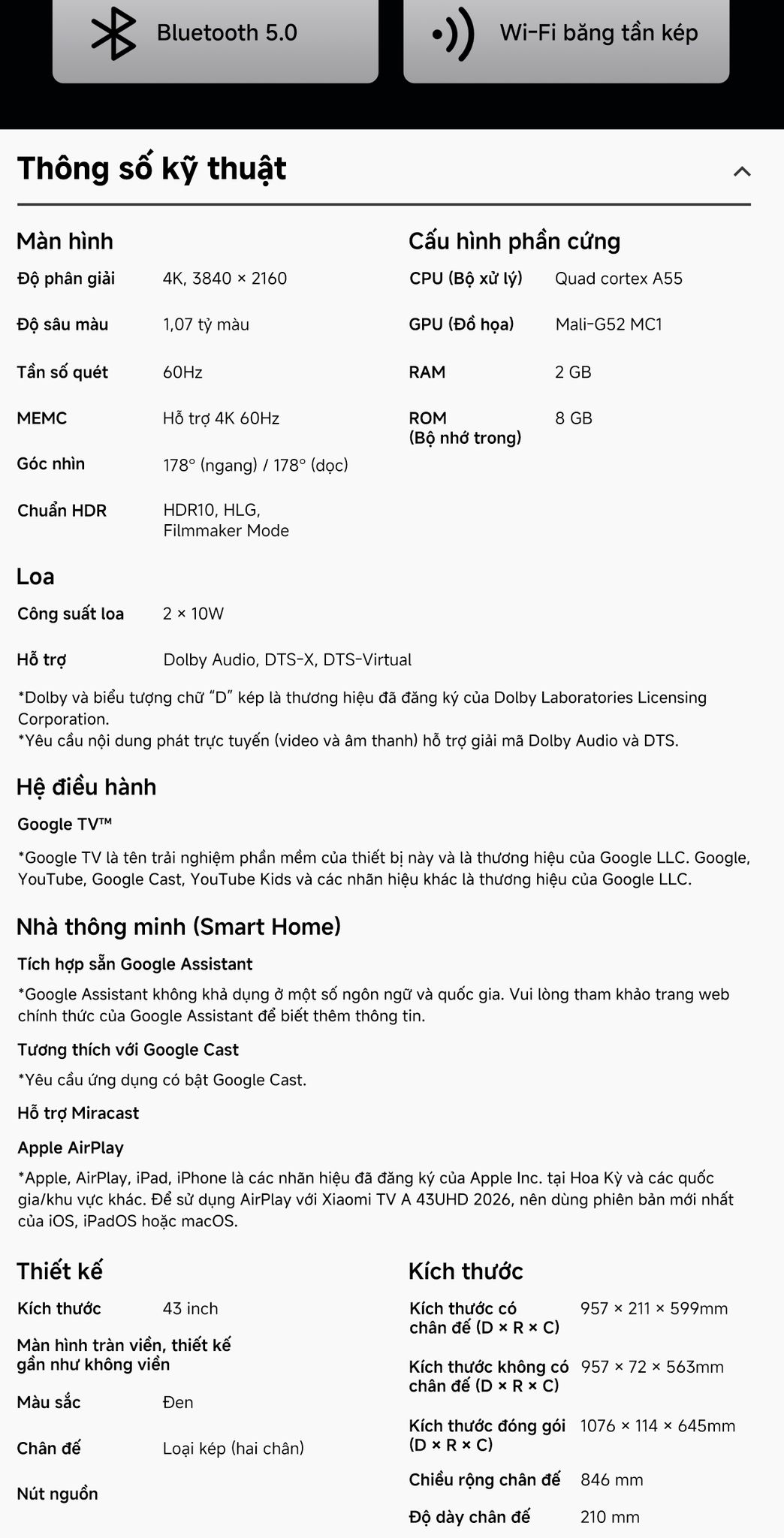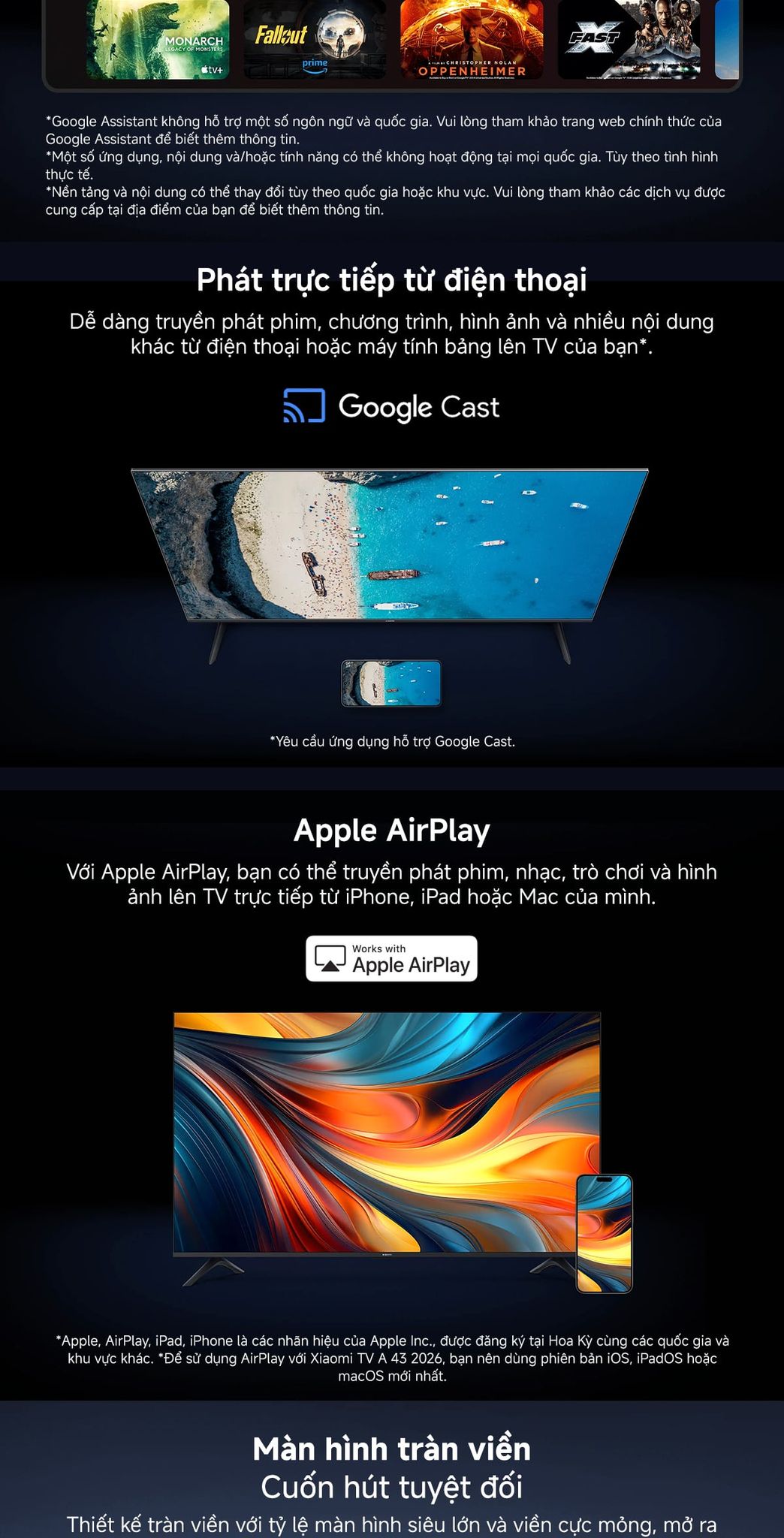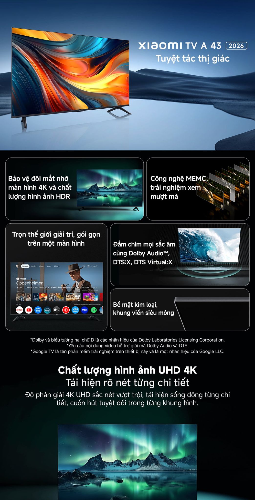xiaomi TV A 43 2026 là thiết bị giải trí không thể thiếu, giúp kết nối mọi thành viên trong gia đình qua những phút giây thư giãn trọn vẹn. Sở hữu độ phân giải sắc nét cùng công nghệ hiển thị hiện đại, xiaomi TV A 43 2026 mang đến hình ảnh sống động, chân thực trong từng khung hình. Nhờ đó, mỗi chuyển động trên màn ảnh đều trở nên mượt mà và cuốn hút, góp phần nâng tầm trải nghiệm giải trí tại gia.