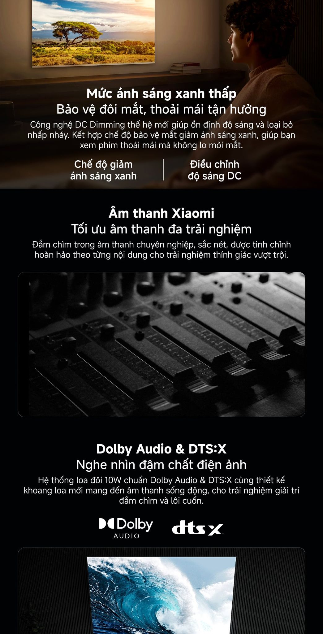- Công nghệ DC Dimming thế hệ mới giúp ổn định độ sáng và loại bỏ nhấp nháy. Kết hợp chế độ bảo vệ mắt giảm ánh sáng xanh, giúp bạn xem phim thoải mái mà không lo mỏi mắt.