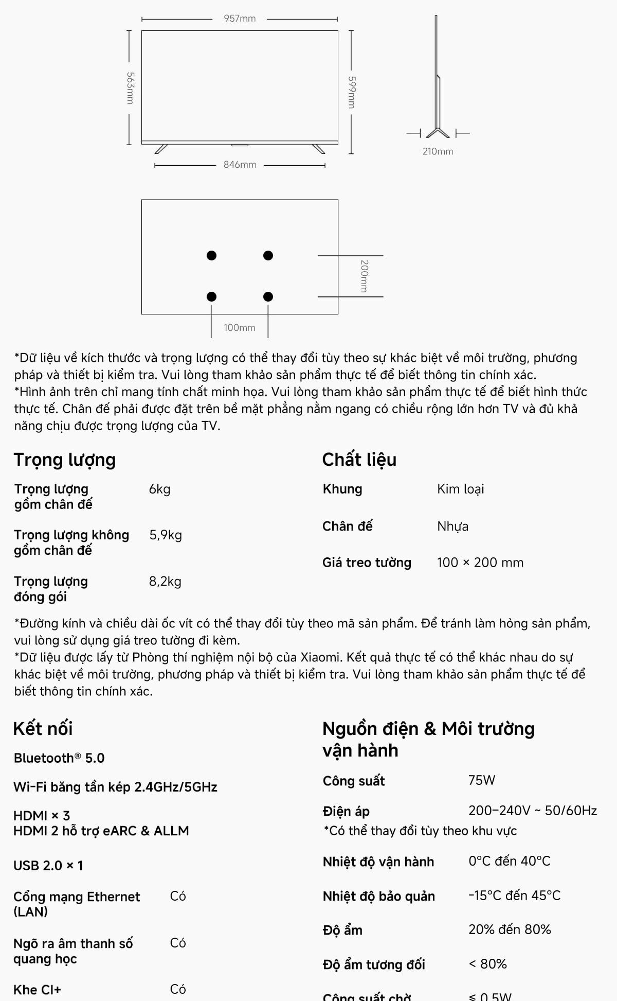 Kích thước không có chân đế (D × R × C) — 957 × 72 × 563mm